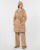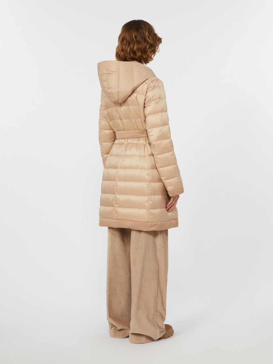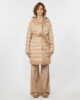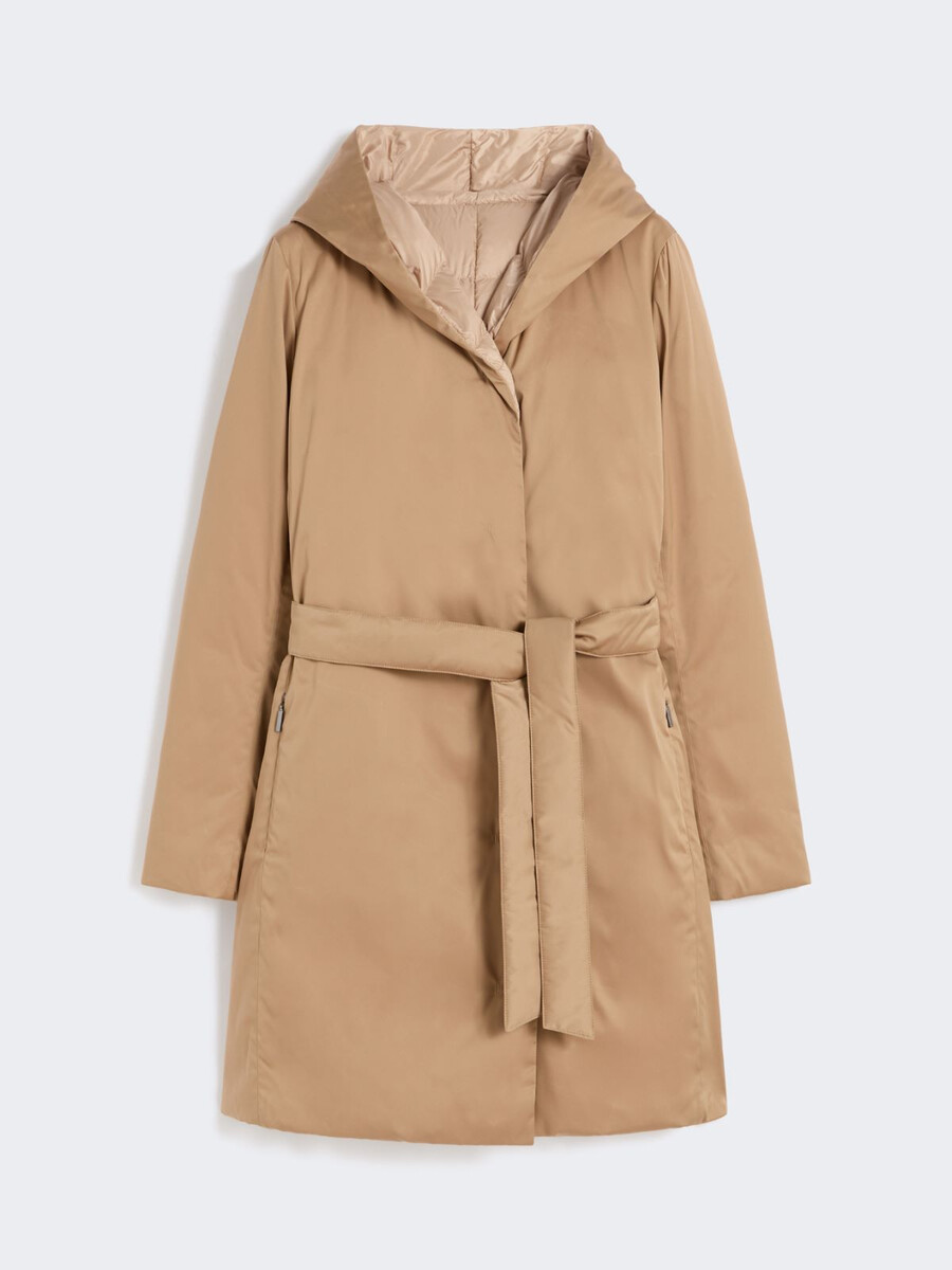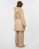 Doudoune mi-longue réversible : un côté présente un motif à rayures horizontales matelassées, l’autre est uni.