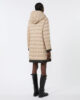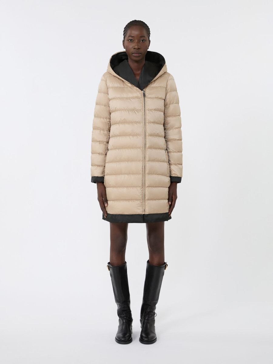 Doudoune mi-longue réversible : un côté présente un motif à rayures horizontales matelassées, l’autre est uni.