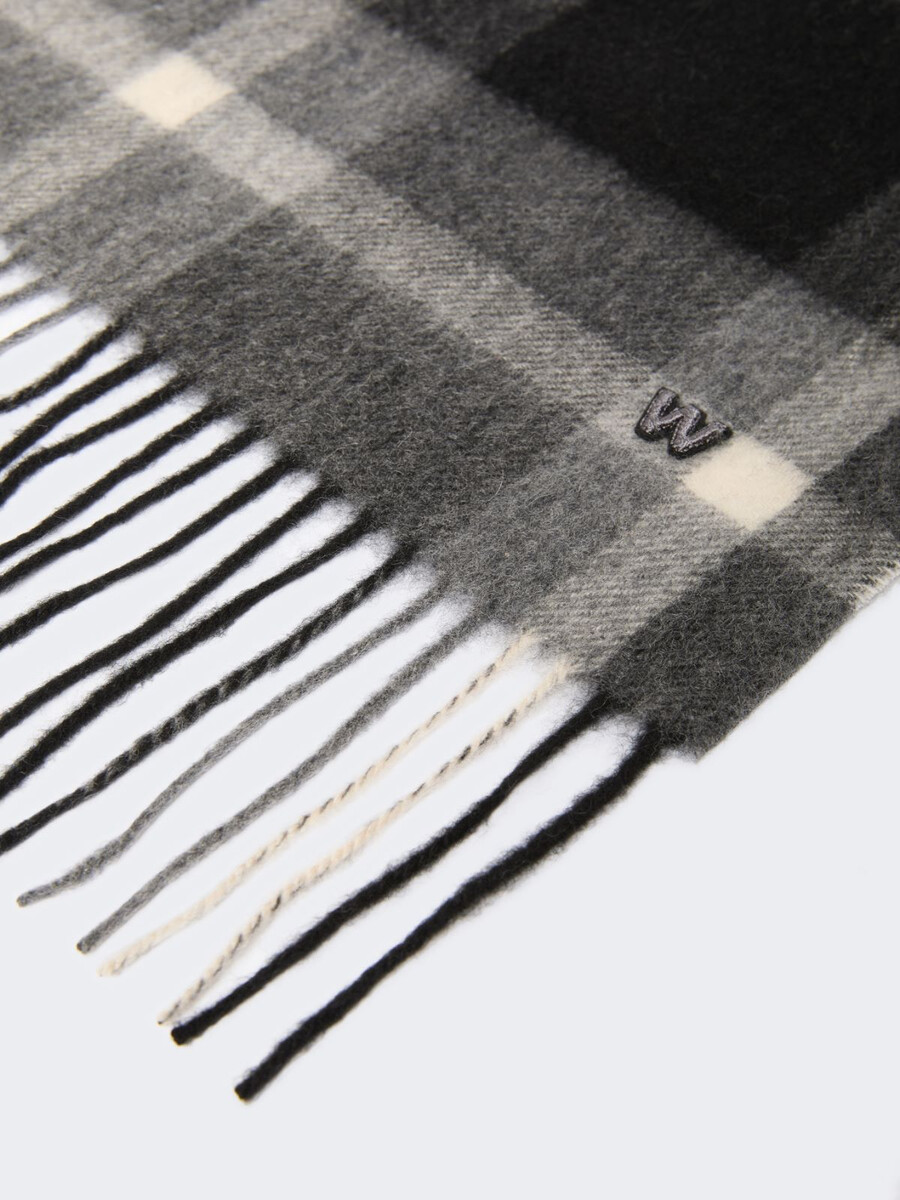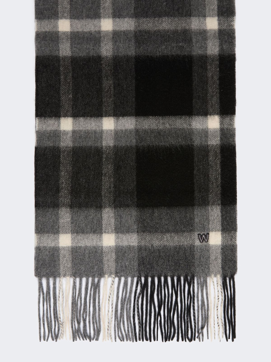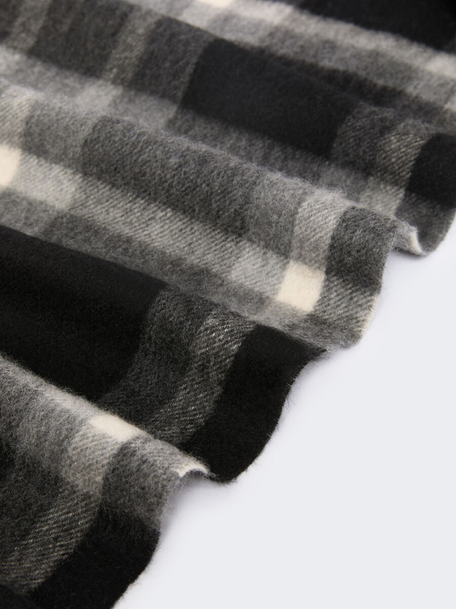 Écharpe rectangulaire longue, ornée d’un motif jacquard et d’un tartan.