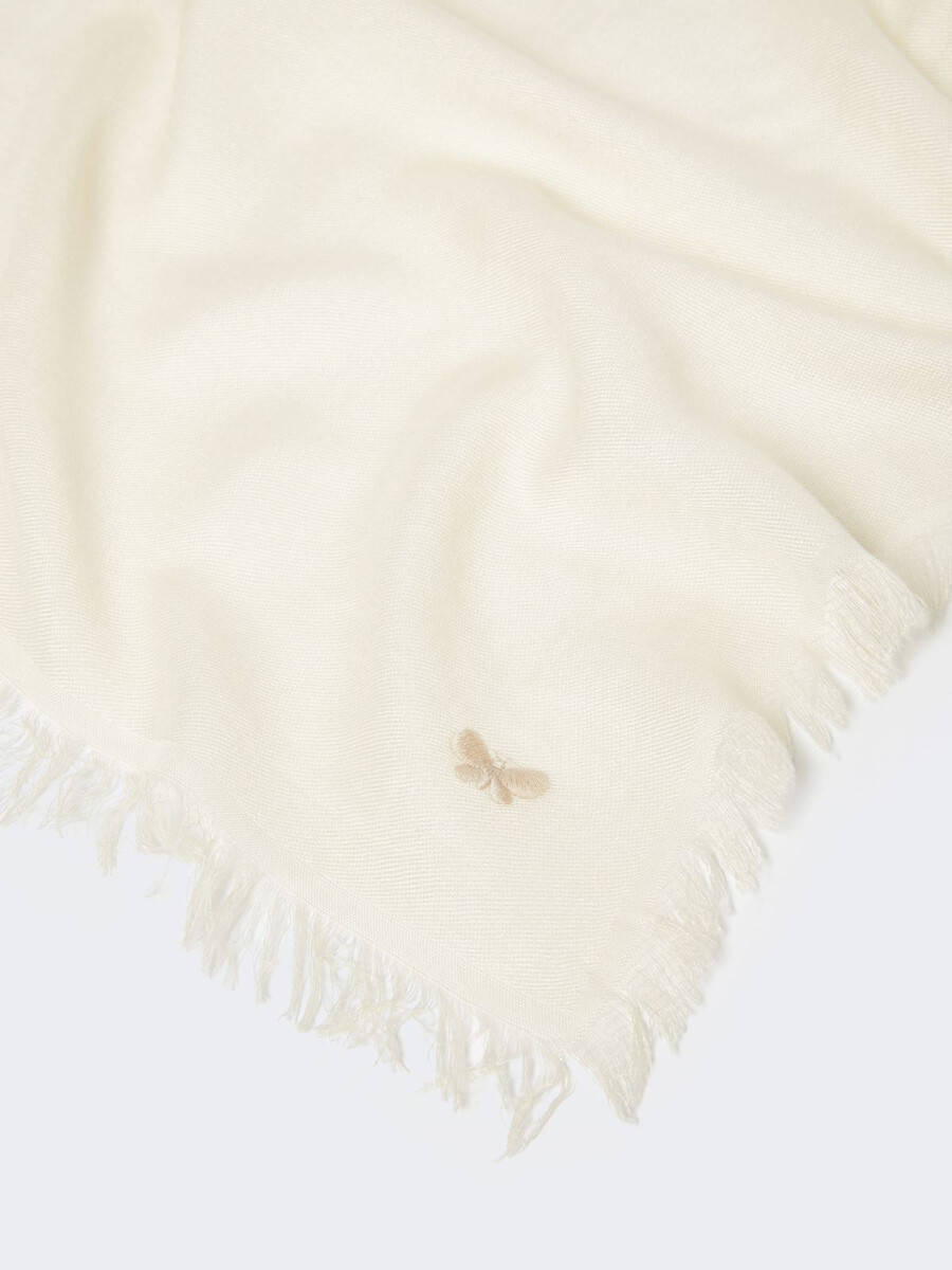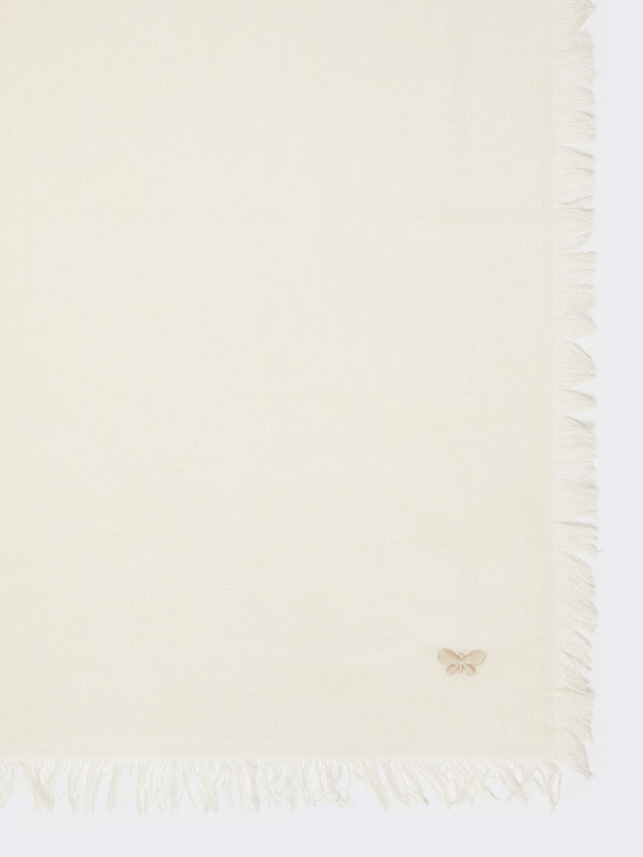 Étole rectangulaire ample ornée d’un petit logo papillon brodé ton sur ton sur l’ourlet.