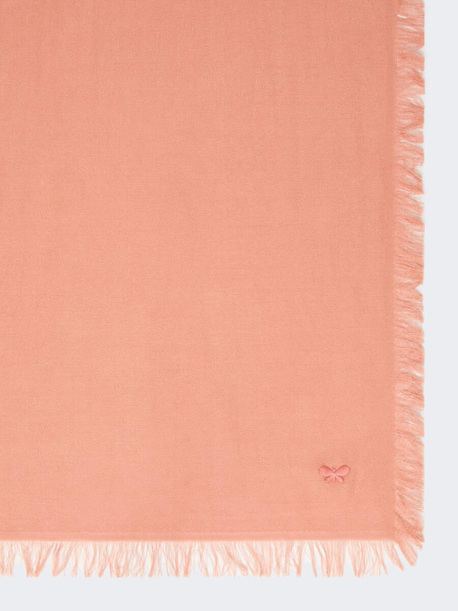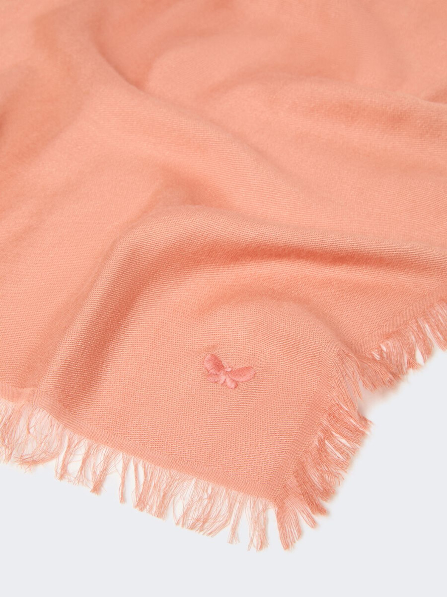 Étole rectangulaire ample ornée d’un petit logo papillon brodé ton sur ton sur l’ourlet.