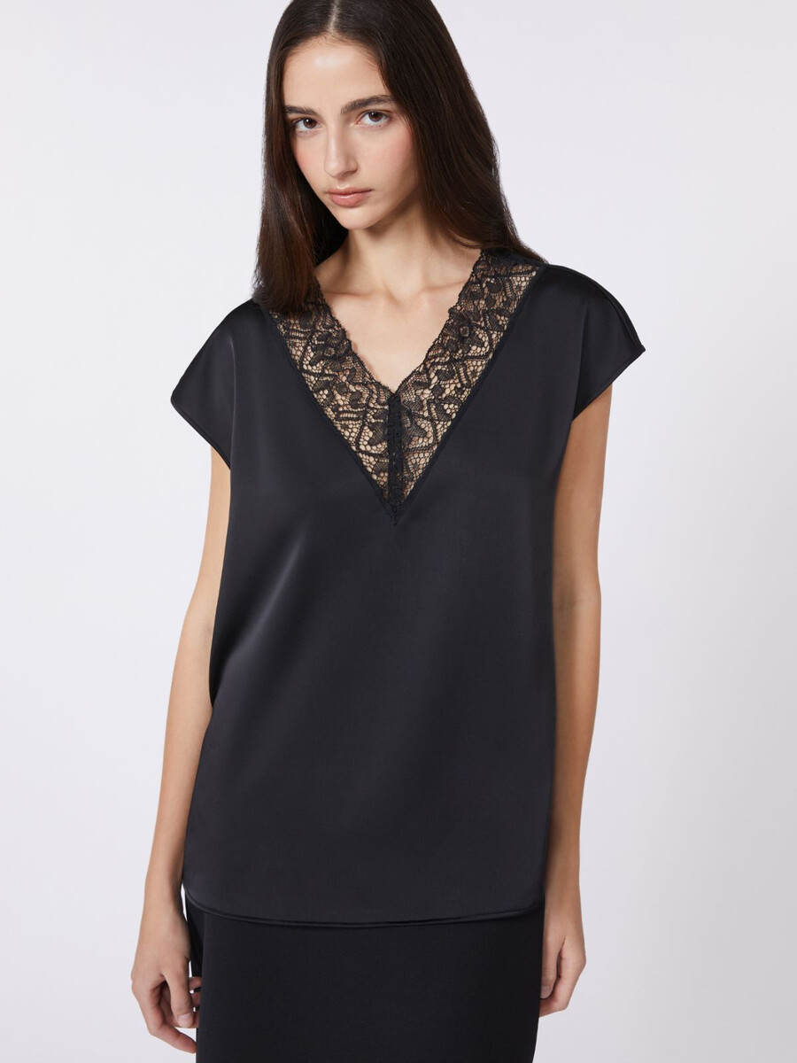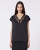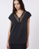 Débardeur sans manches orné d’une dentelle passementerie à l’encolure.