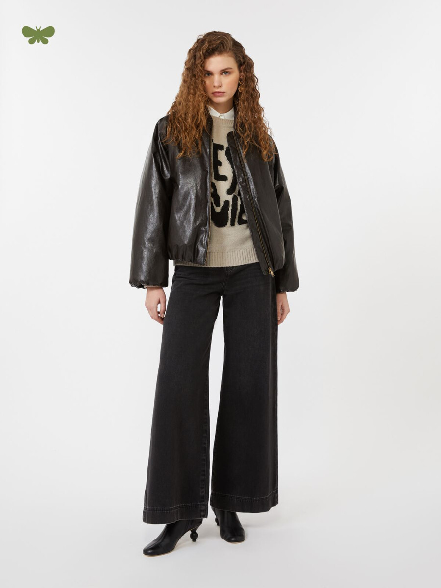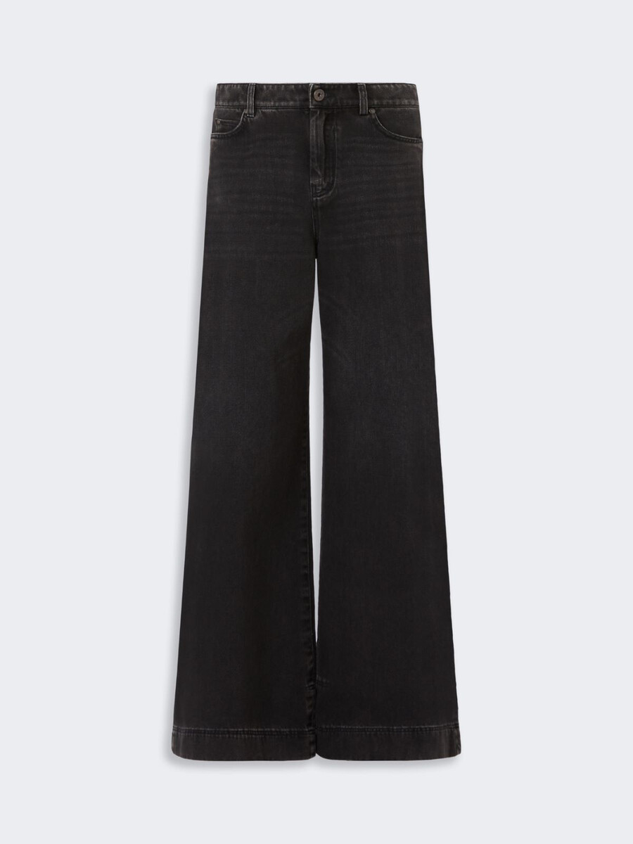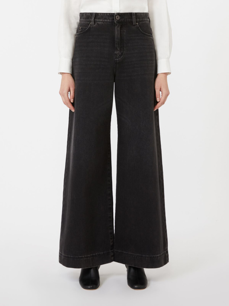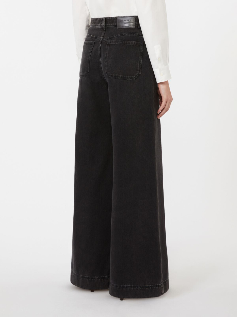 Pantalon en denim pur coton. Ce vêtement arbore une texture authentique, des poches avant et des poches arrière plaquées. Les surpiqûres profondes aux ourlets soulignent la coupe large. Fermeture zippée et boutonnée.