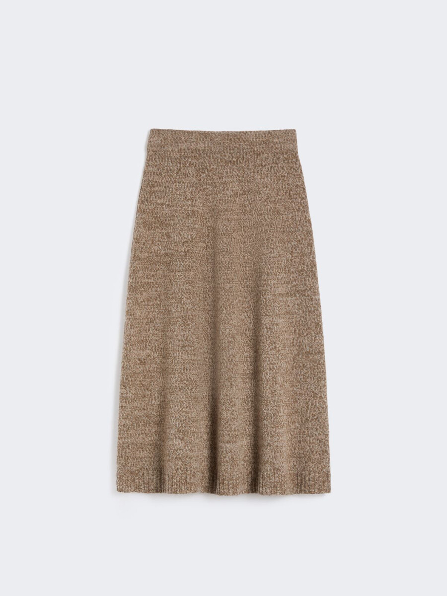 Jupe midi à la coupe trapèze caractéristique.