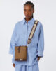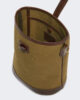 Petit sac seau à base ovale inspirée des années 70/80. Bandoulière amovible en cuir – portée épaule ou croisée – avec fermoir réglable et anneau en D pour attacher de petits accessoires en cuir.