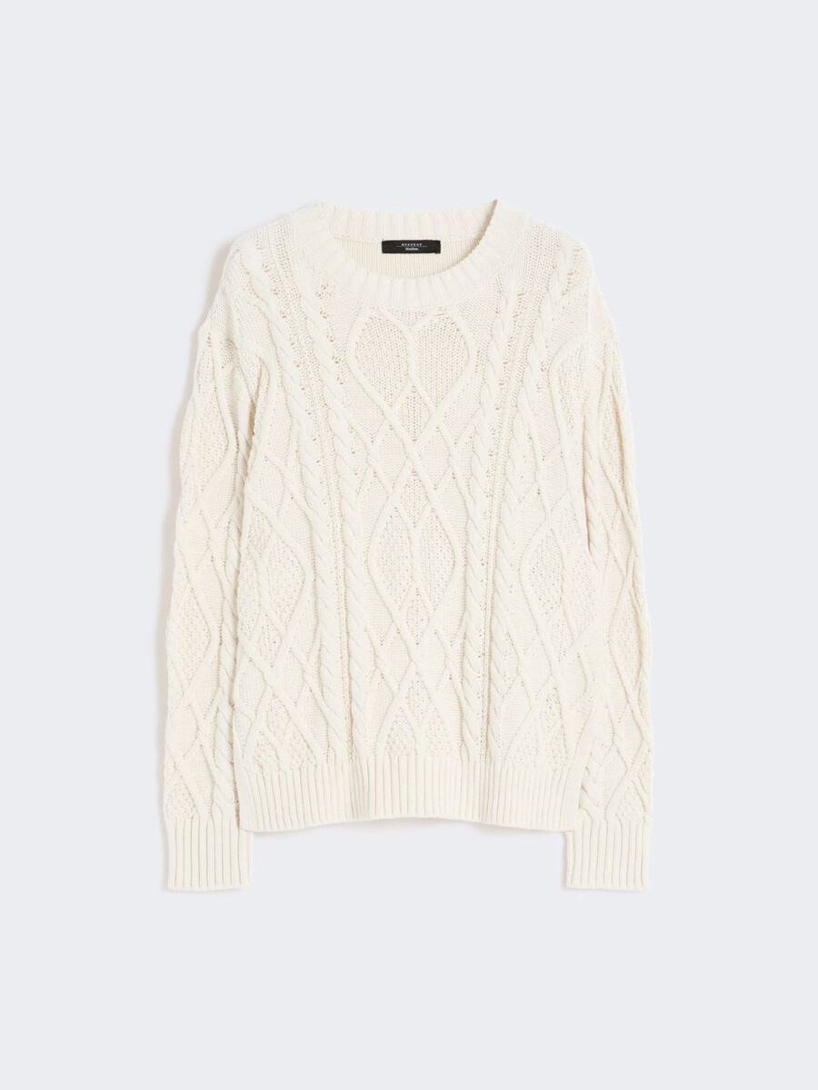 Pull multi-mailles orné de torsades et de losanges sur le devant et les manches.