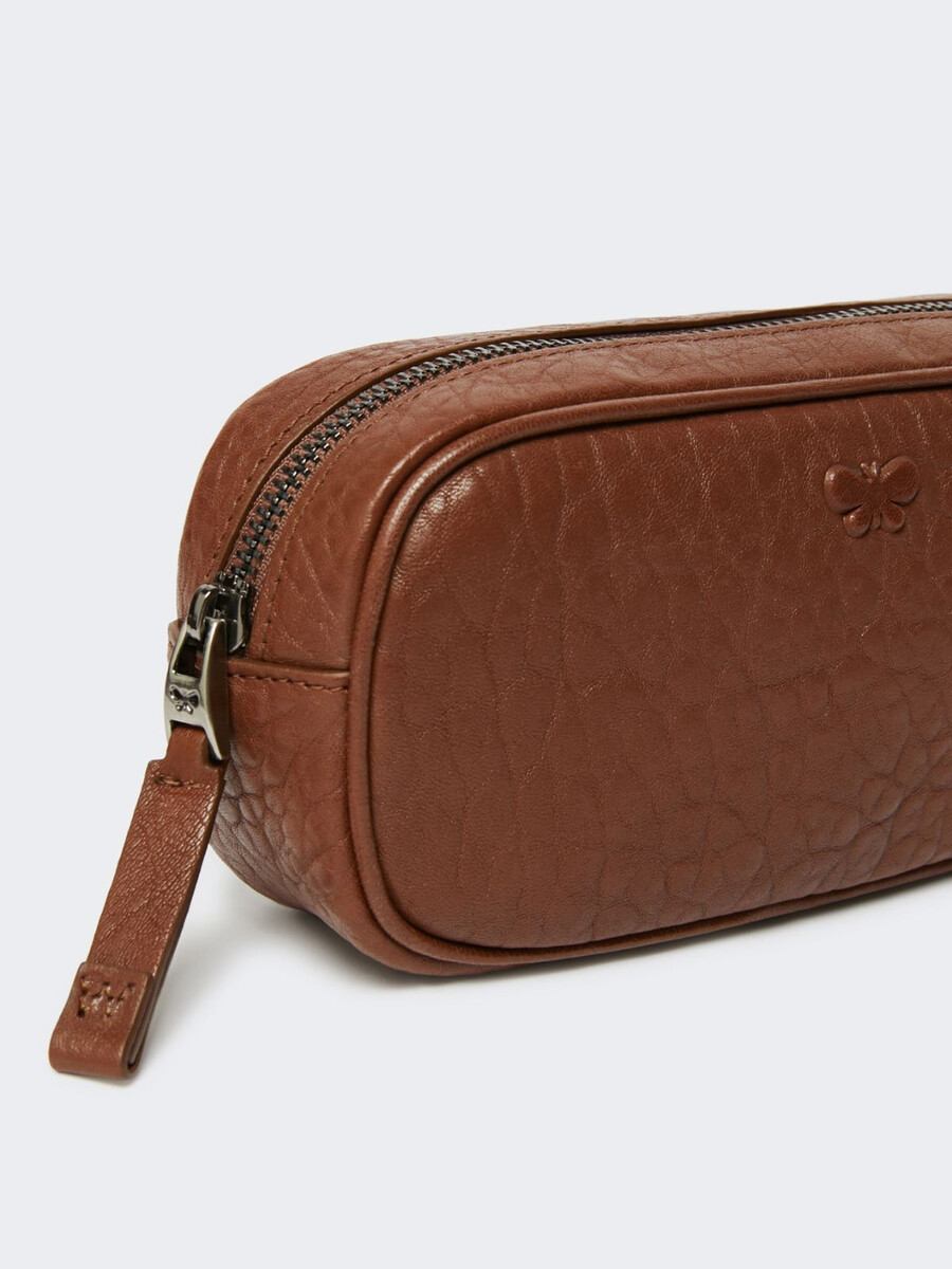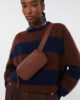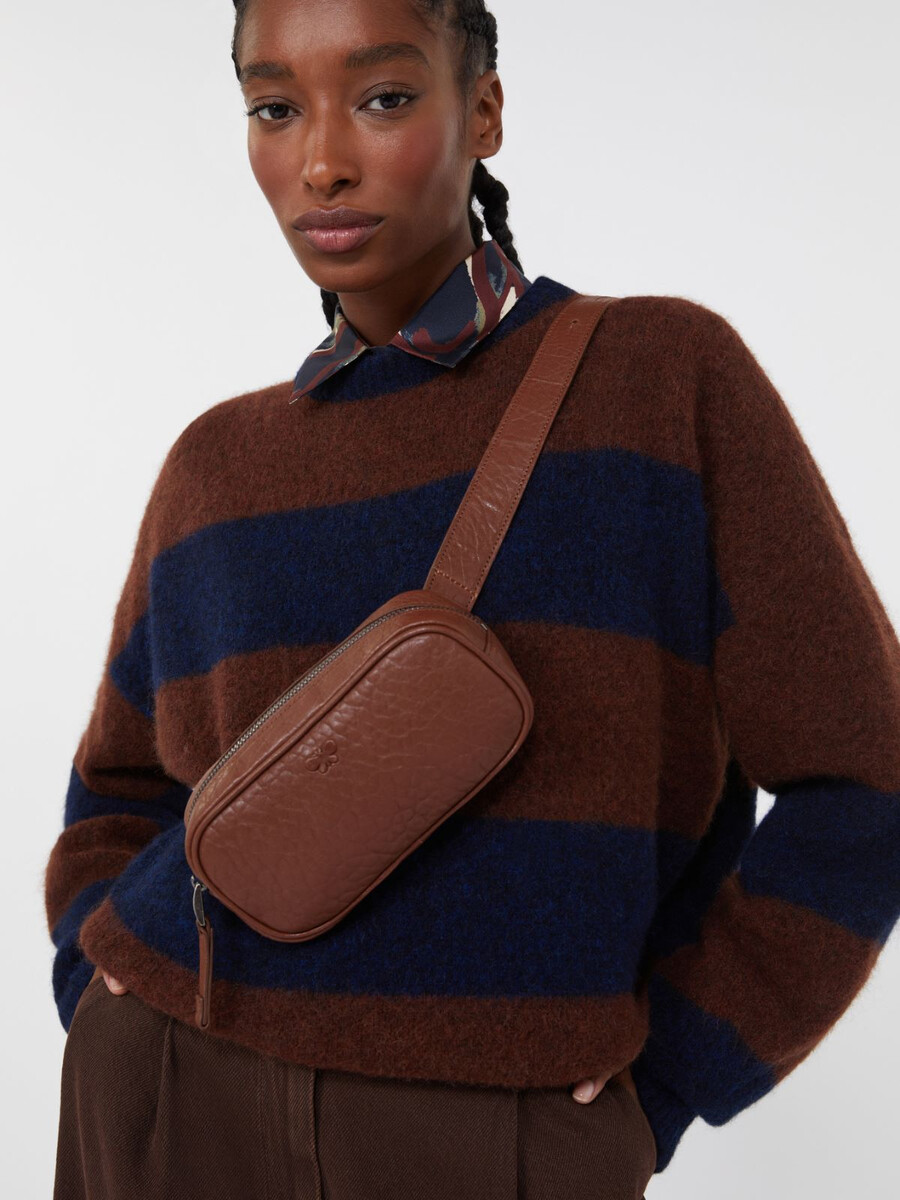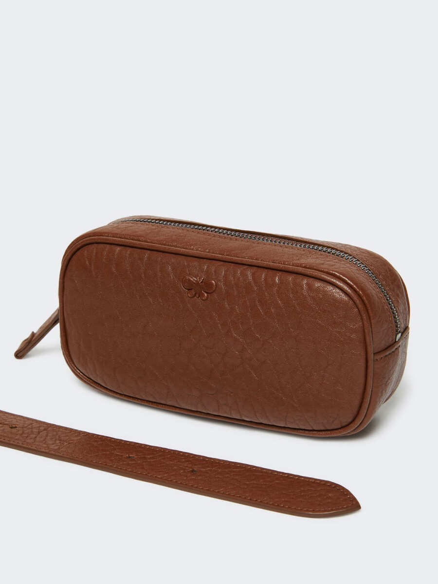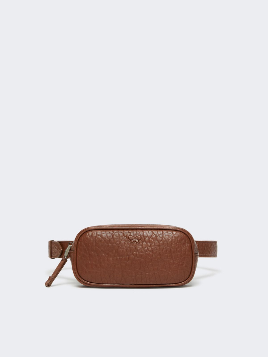 Pochette compacte aux bords arrondis. Sa bandoulière ajustable et amovible permet de la porter à la taille, en bandoulière ou à la main.