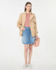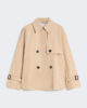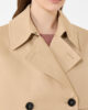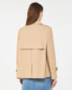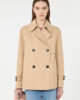 Trench-coat court croisé, caractérisé par son rabat tempête et ses pattes de serrage aux poignets.